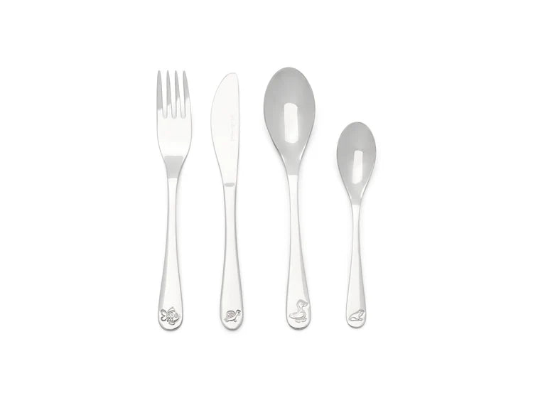 Een 4-delig kindercouvert met verschillende afbeeldingen van vijverdieren. Op de vork is een vis afgebeeld, op het mes een schildpad, op de eetlepel een eend en op de paplepel een kikker. Dit kindercouvert bevat een leuke geschenkverpakking dat als cadeau gegeven kan worden voor een geboorte, doop of andere gelegenheid.