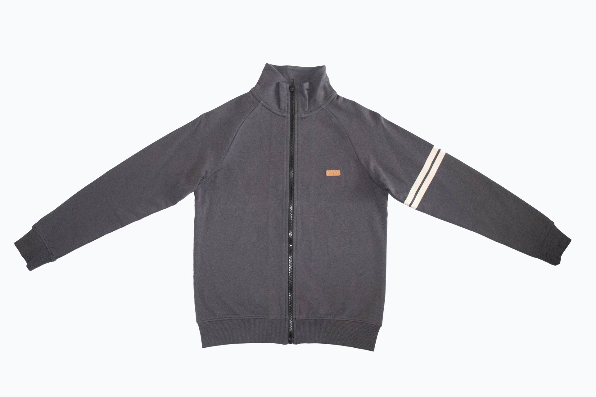 Antraciet jongensvest met opvallende witte strepen op de mouwen, voor een stoere en dynamische look.