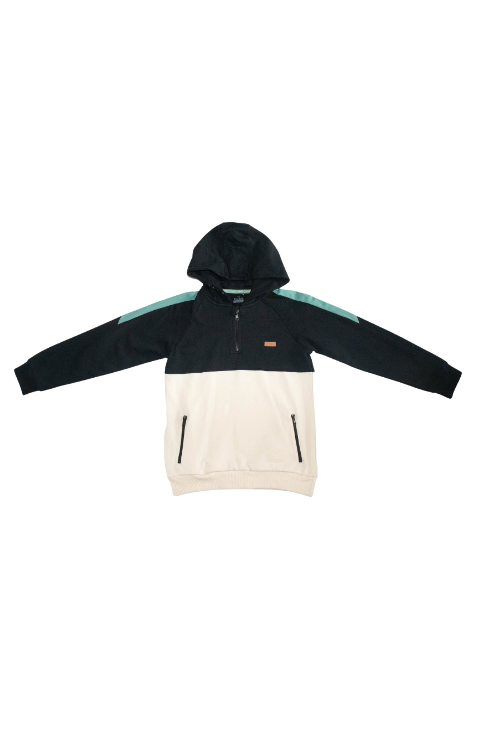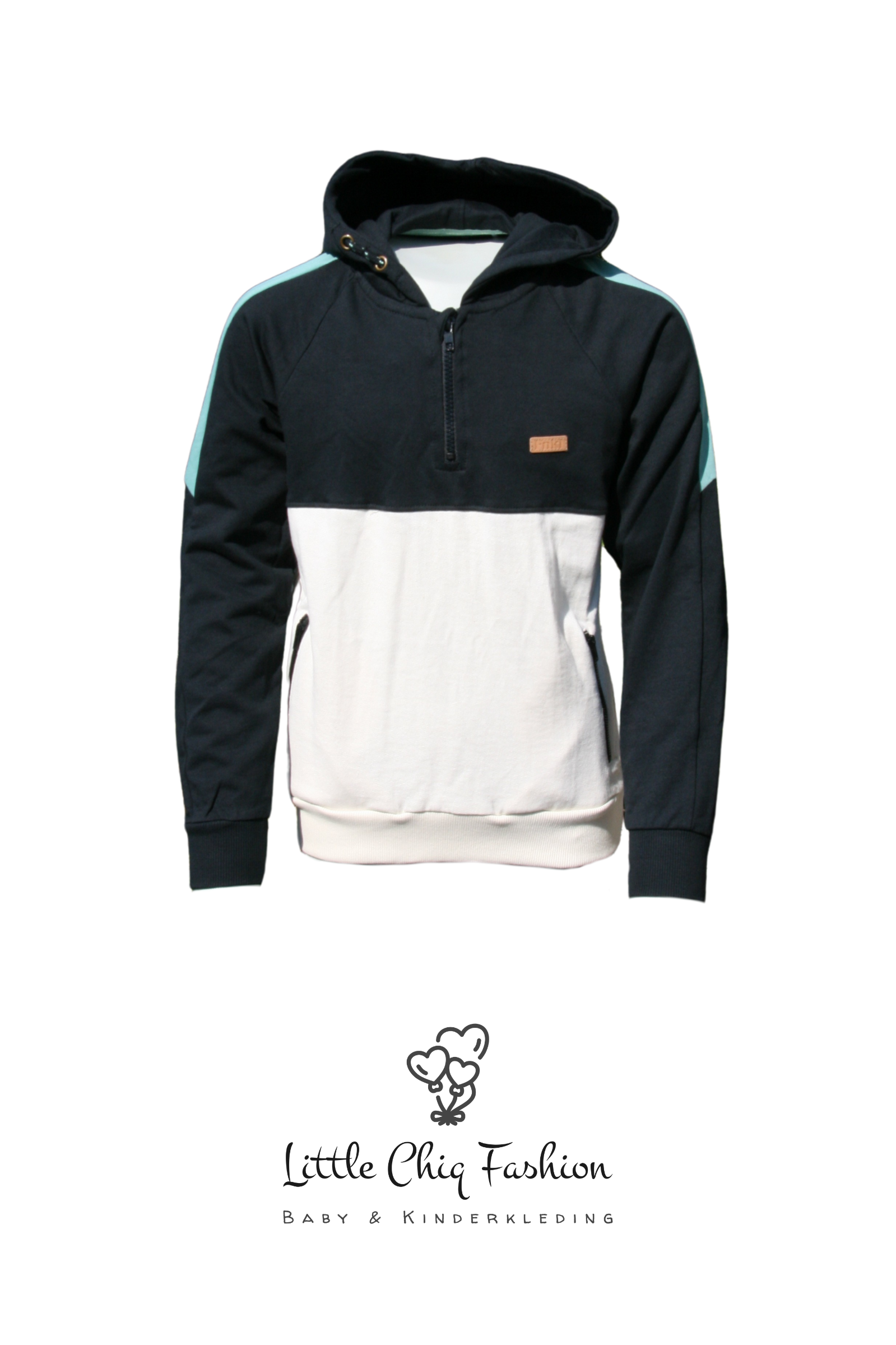 Deze jongens hoodie in wit en zwart heeft een sportieve groene bies over de schouder. Gemaakt van zacht materiaal, biedt de hoodie comfort en stijl. De capuchon en elastische boorden zorgen voor een perfecte pasvorm, ideaal voor casual of sportieve dagen.