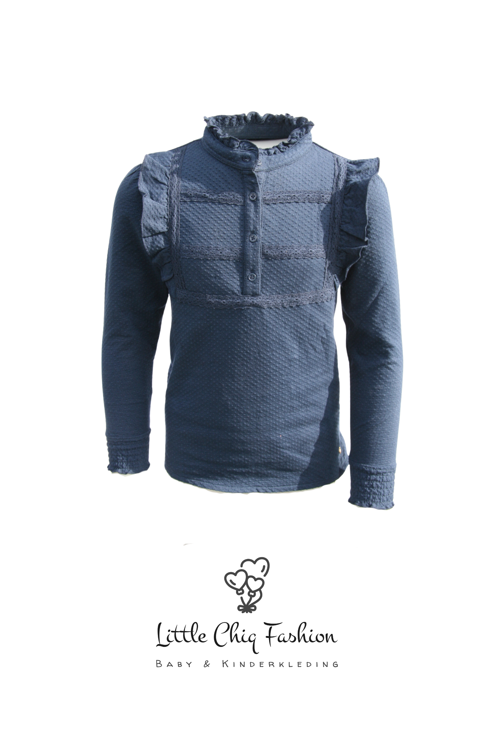 Donkerblauwe meisjes blouse met een elegante volant en fijne broderie, voor een verfijnde en speelse uitstraling.