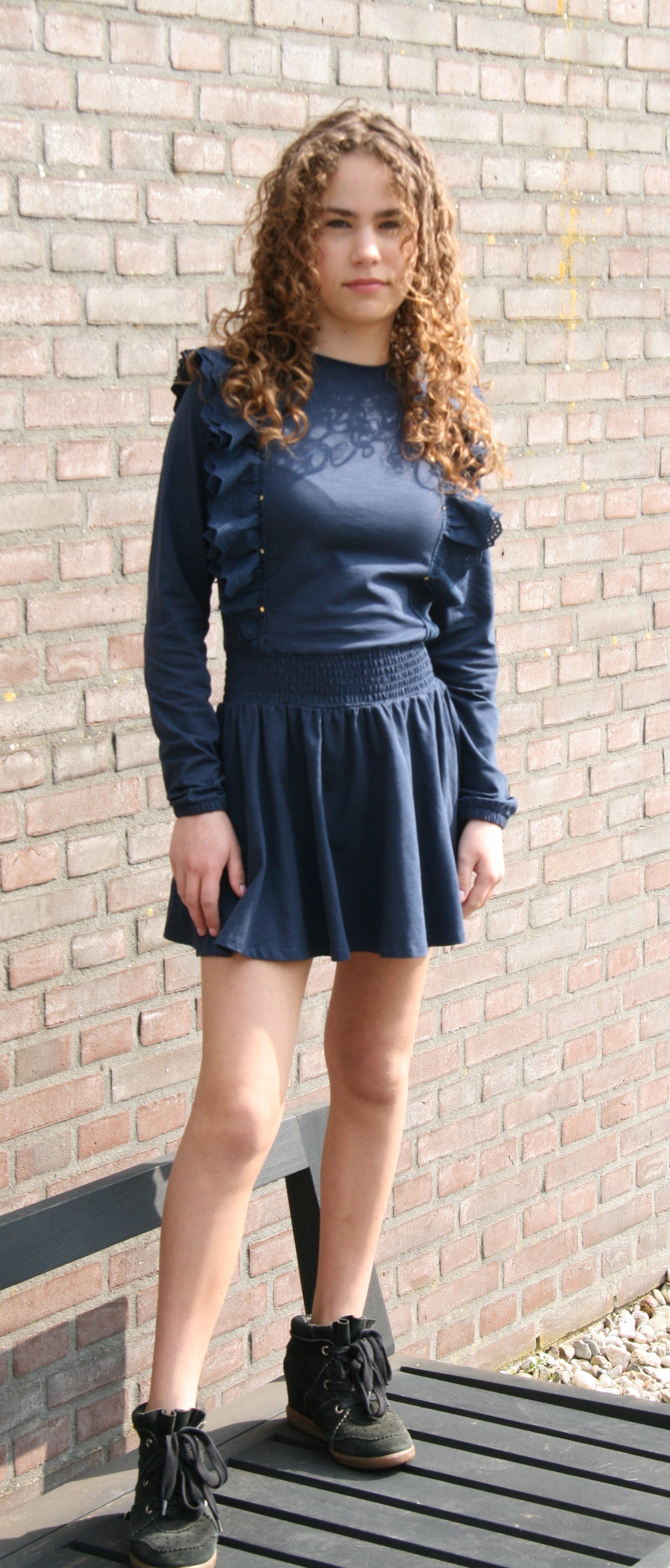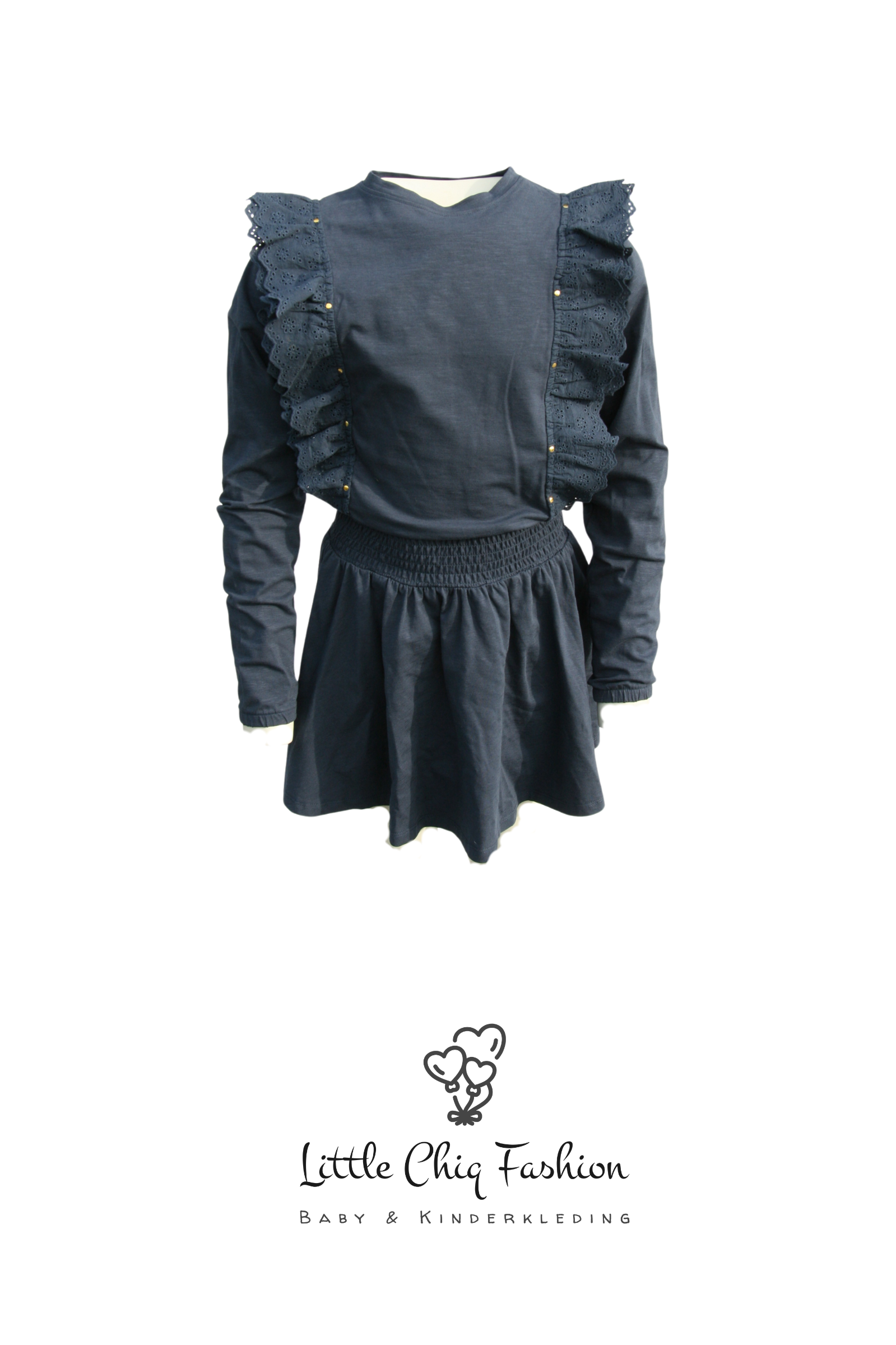 Donkerblauw tricot jurkje voor meisjes met gouden accenten en een charmante volant, voor een stijlvolle en speelse look.