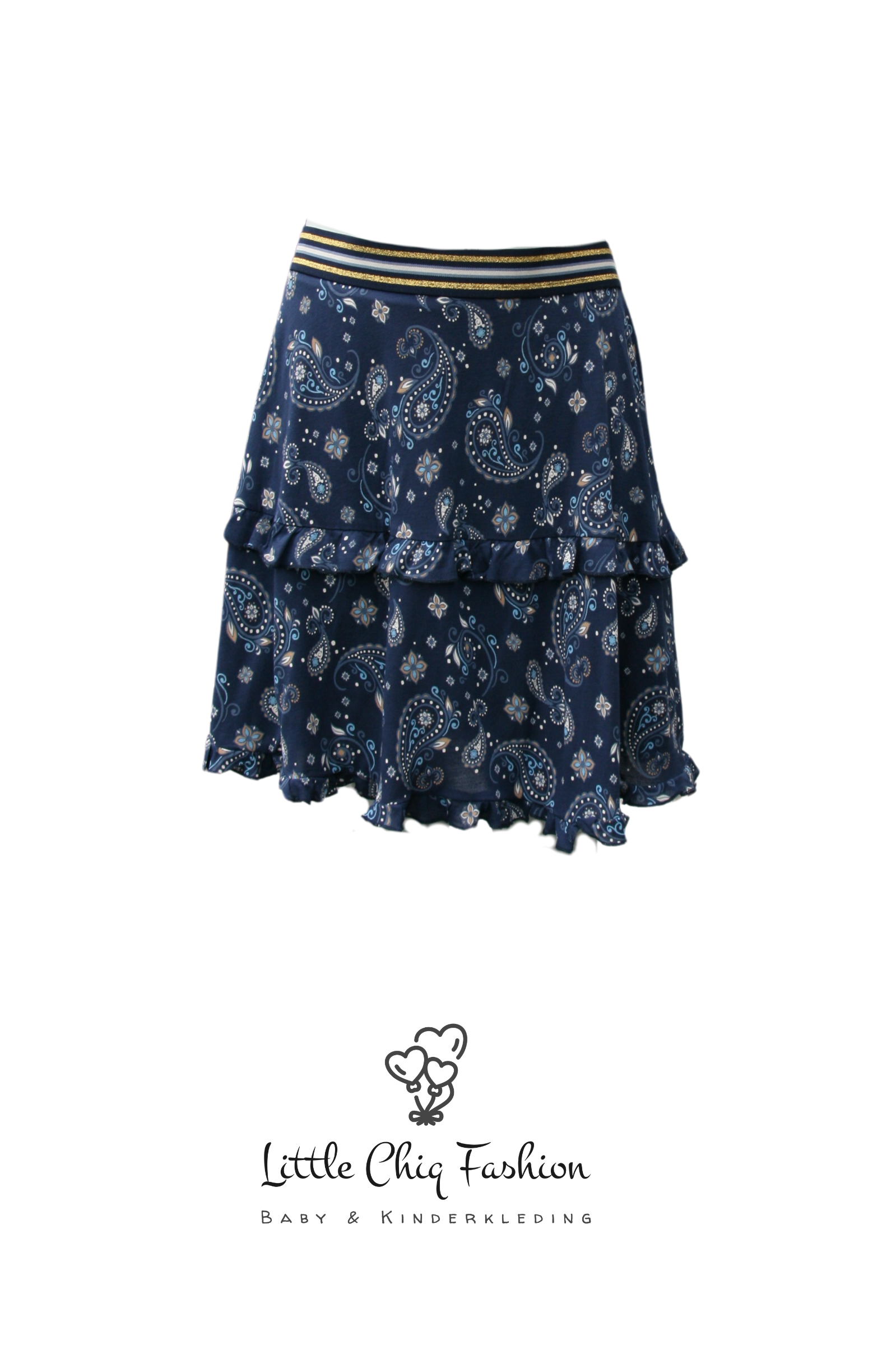 Donkerblauw print rokje met een band afgewerkt met goud glitter, voor een stijlvolle en sprankelende look.