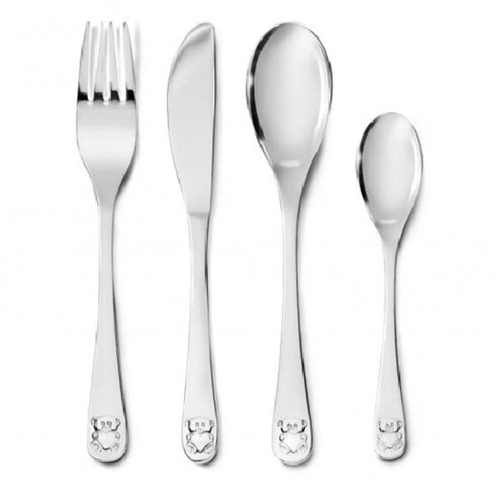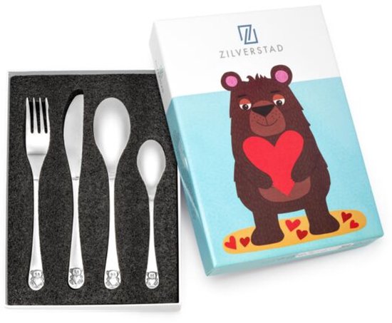 Het 4-delige bestek setje bestaat uit een vork, mes, lepel en dessertlepel. Op elk bestekje staat onderaan een prachtige beer met een hartje afgebeeld in reliëf. De details zijn heel mooi uitgewerkt! Een besteksetje is altijd een mooi en persoonlijk cadeau om te geven. Door het duurzame materiaal is het een blijvend cadeautje, maar ook een cadeautje dat veelvuldig gebruikt zal worden! Dit prachtige besteksetje wordt geleverd in een mooi doosje.