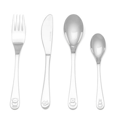 Bestekset van het wereldberoemde konijntje nijntje met haar vriendjes. Op drie bestekdelen staat een vriendje van nijntje afgebeeld en op het kleine paplepeltje staat nijntje zélf. Het bestek is 4-delig en kan gereinigd worden in de vaatwasser. Maak het bestek persoonlijk door het te laten graveren.