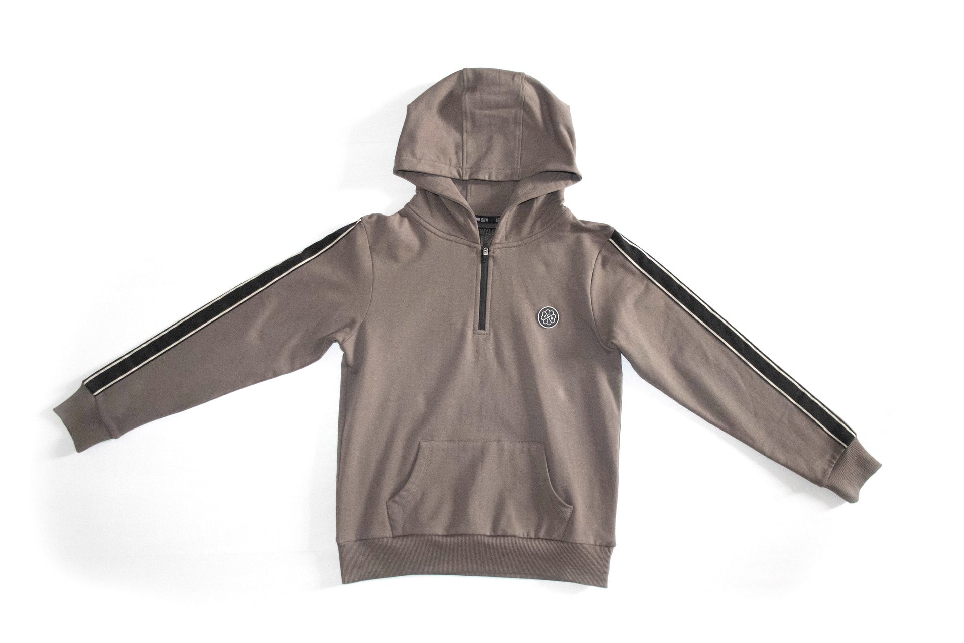 Deze taupekleurige hoodie is een stijlvolle basic met net dat beetje extra. De streep op de mouw geeft 'm een sportieve look, terwijl de zachte stof zorgt voor ultiem draagcomfort. Perfect voor schooldagen, chillen of actief buiten zijn – een favoriet voor elke dag!