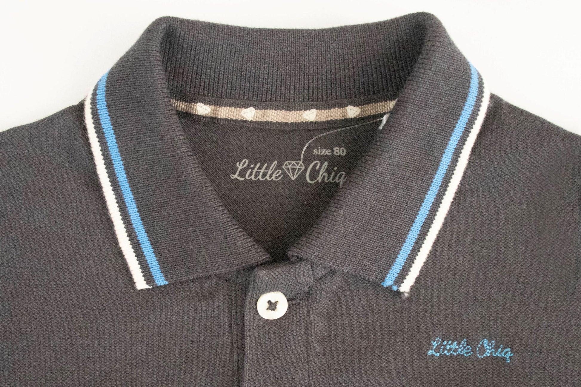Little Chiq Polo antraciet met blauw en wit detail in de kraag en mouw