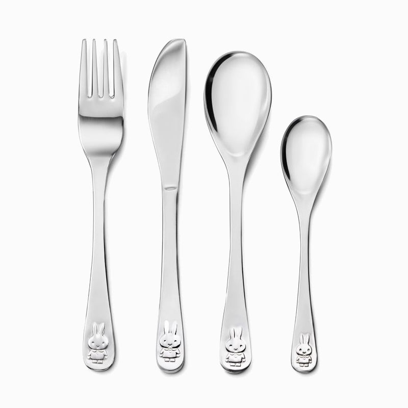 4-delige kinderbestek van Zilverstad van het wereldberoemde konijntje Nijntje. Op ieder bestekonderdeel staat de afbeelding van Nijntje. Omdat het bestek niet is vervaardigd uit zilver maar op 18/10 RVS, kan het in de vaatwasser. Alle bestekonderdelen kunnen worden gegraveerd
