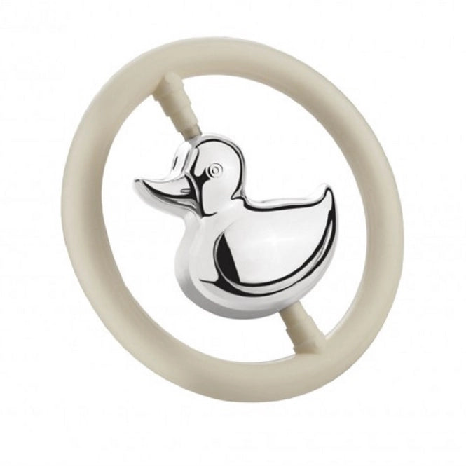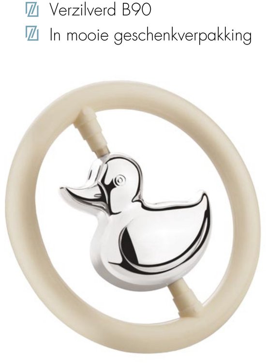 Verzilverde rammelaar van Zilverstad heeft een eendje in de ring. De rammelaar is getest als veilig kinderspeelgoed, waardoor u uw kind veilig kunt laten spelen. Het eendje is gemaakt van metaal en heeft een glanzend oppervlak en een schattig design
